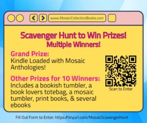 To introduce you to all the pages, we’re sending you on a Scavenger Hunt for the giveaway. Several winners will be chosen with the grand prize winner receiving a Kindle loaded with every Mosaic anthology!